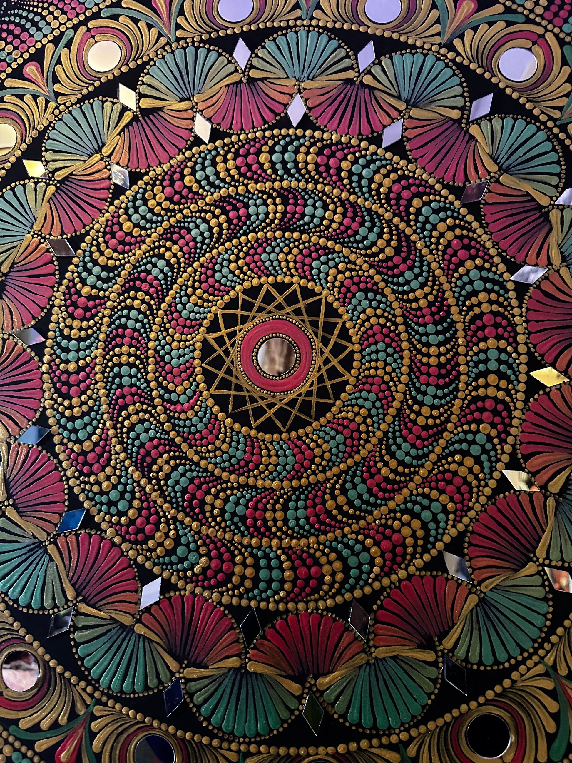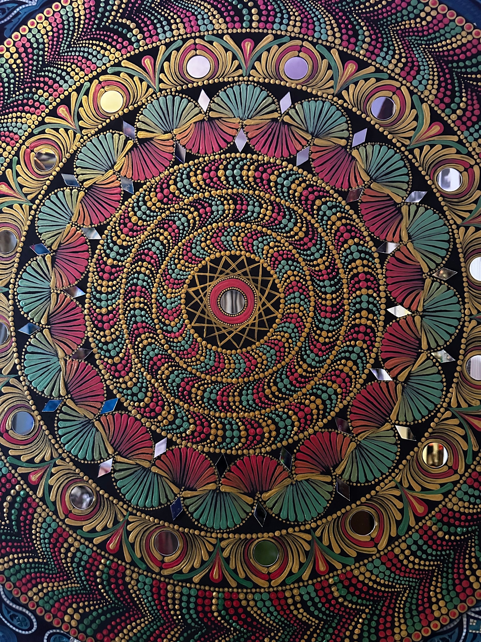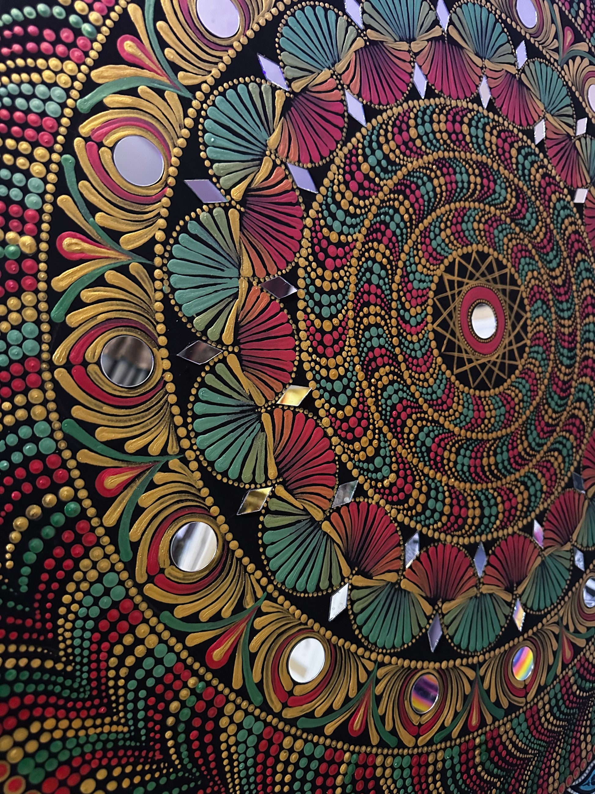 Meditation Mandala, painted on a 30" table top with metallic acrylic paint. Adorned with mirrors
