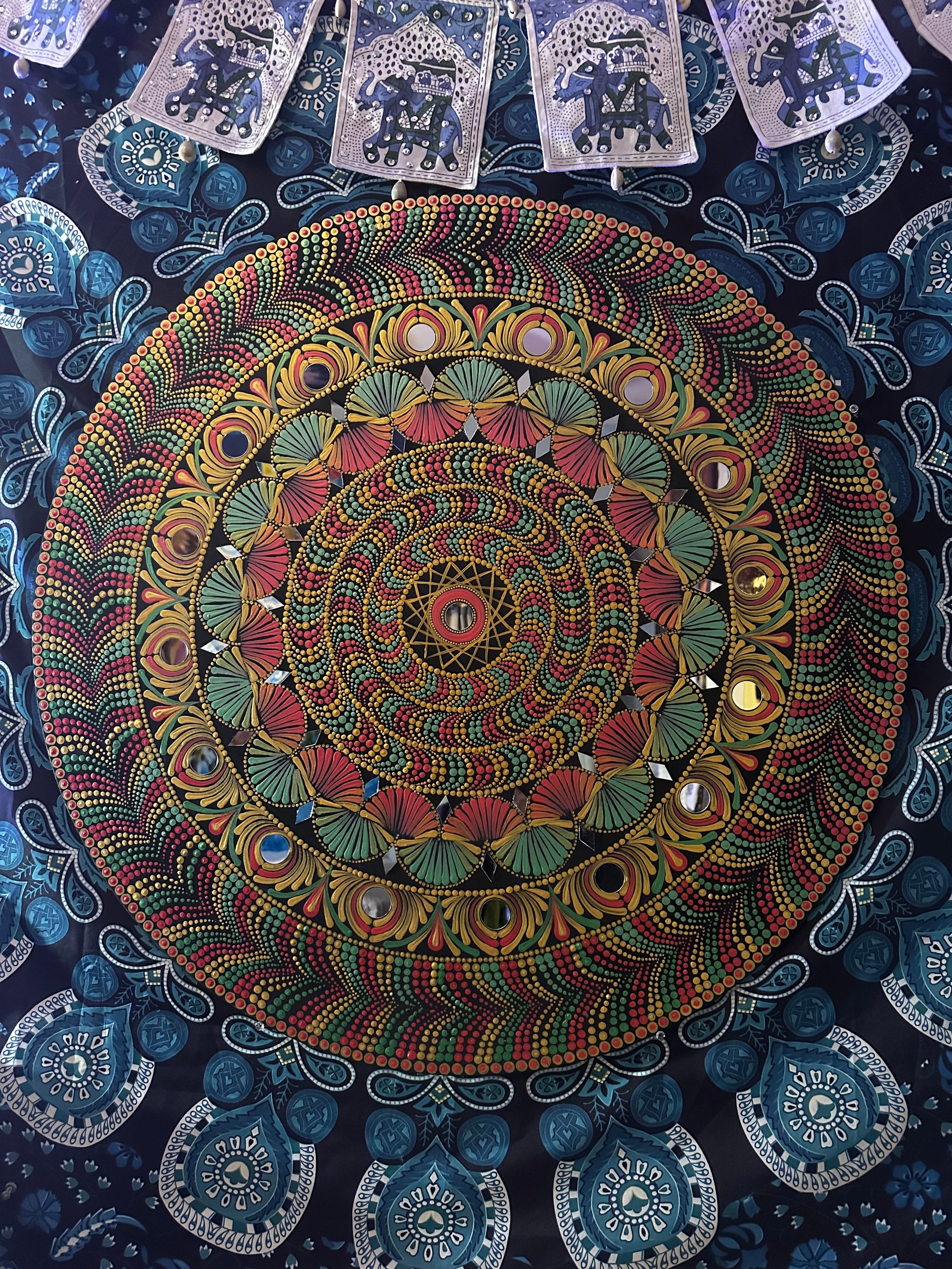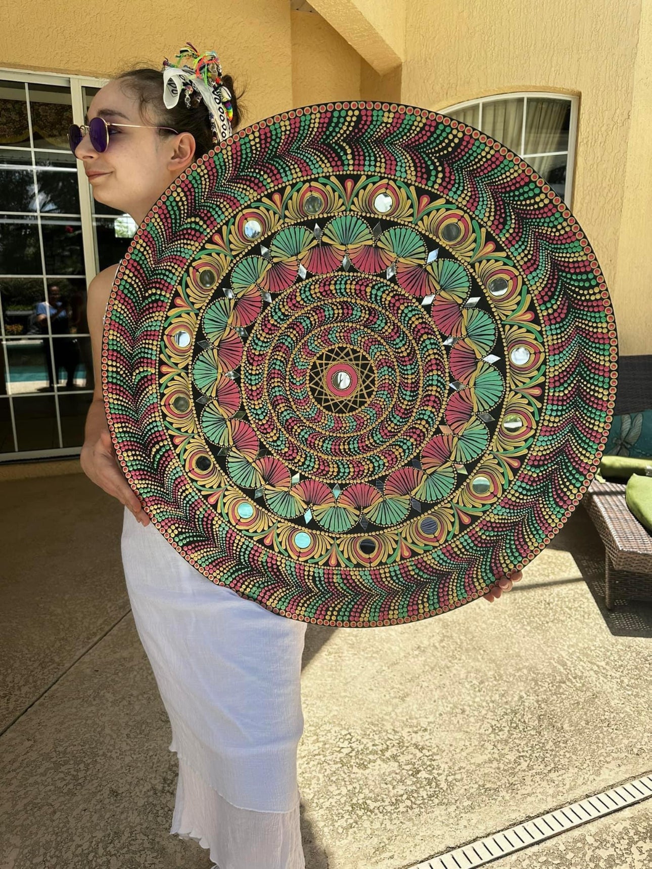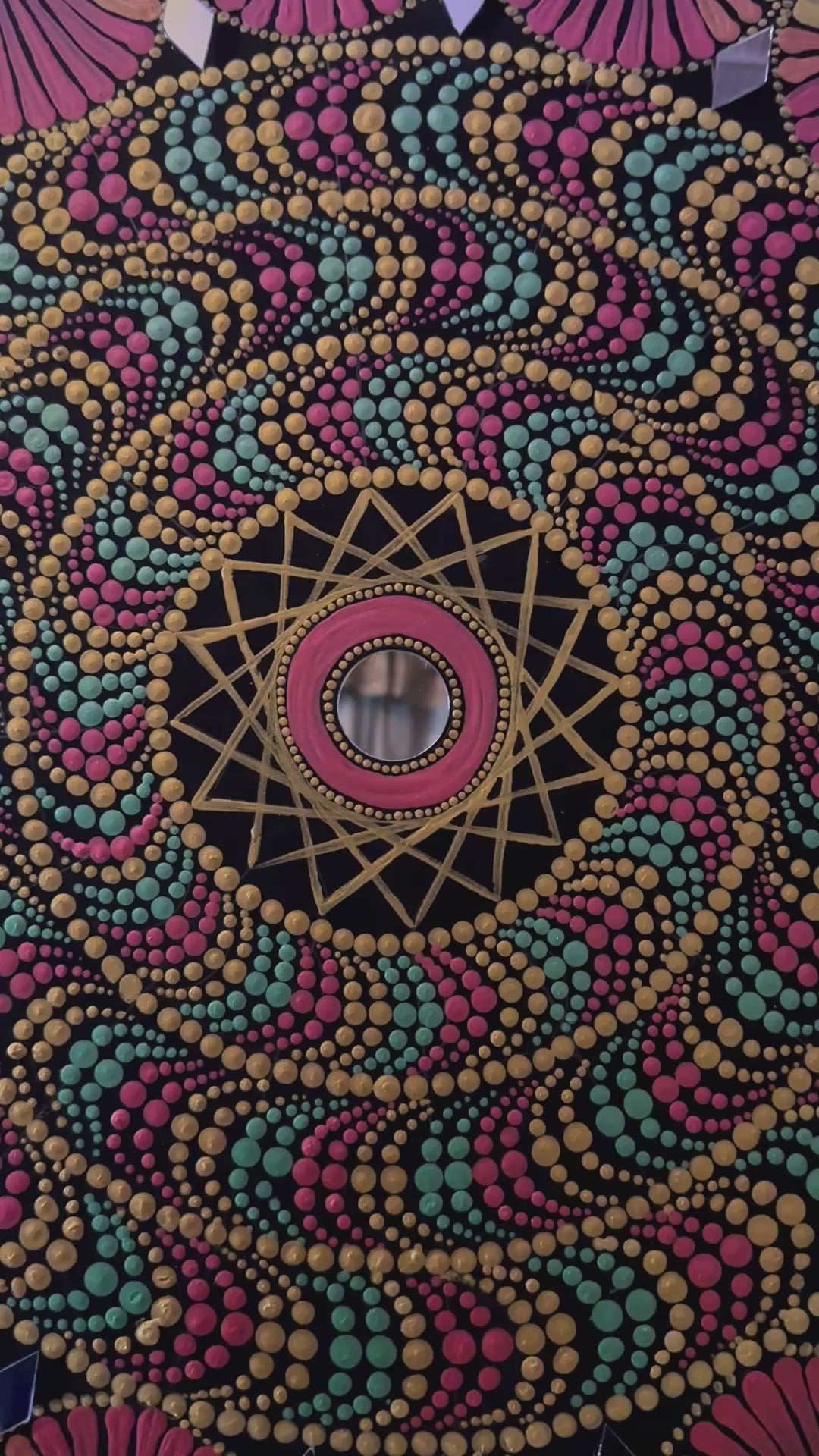 Meditation Mandala, painted on a 30" table top with metallic acrylic paint. Adorned with mirrors